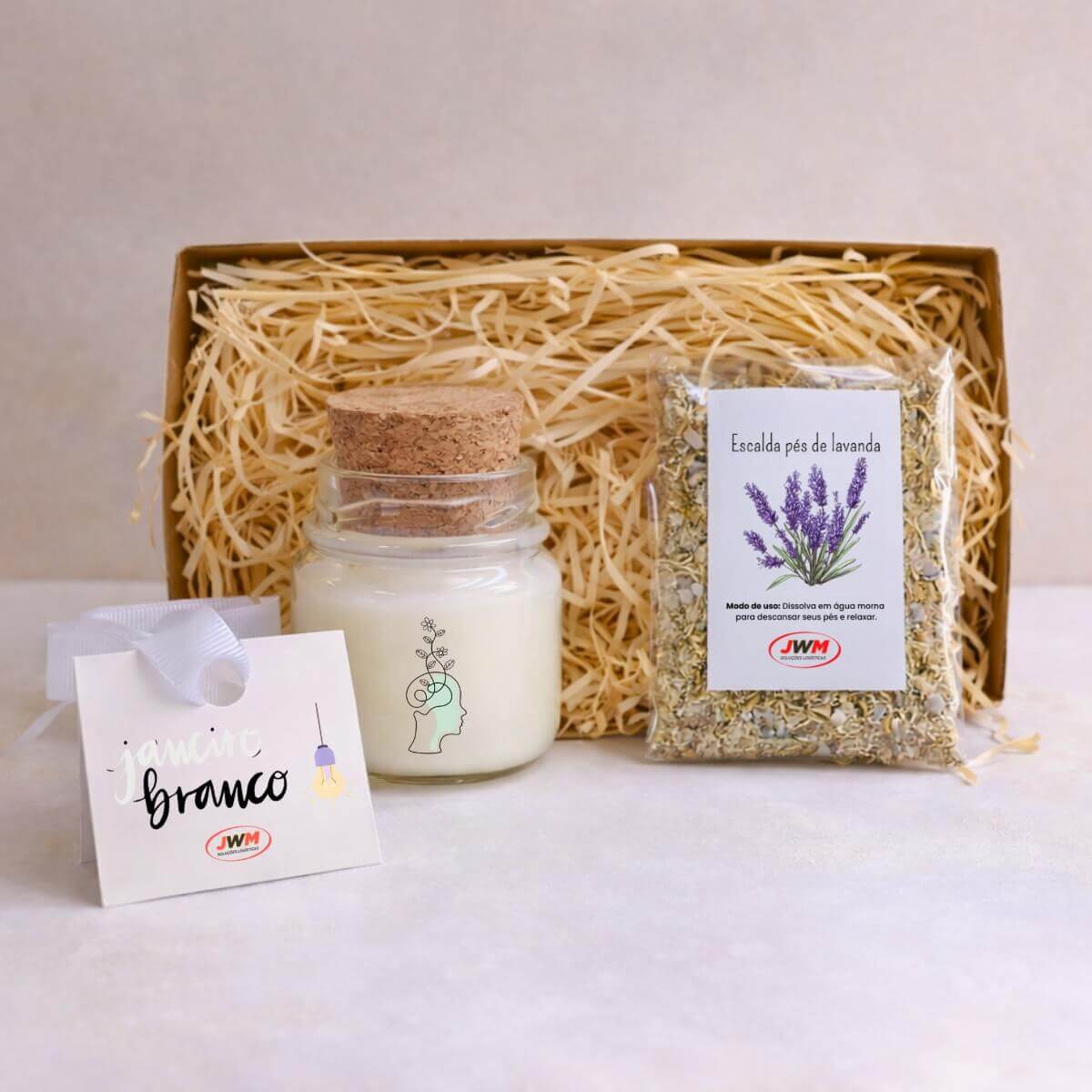O presente ideal para transformar qualquer ocasião em um momento de bem-estar! O Kit Presente Escalda Pés Mini Vela Caixa - Zen é uma caixa presente completa, que une um sachê de ervas naturais para banho relaxante dos pés e uma mini vela artesanal com cera vegetal. Este kit para presente feminino criativo cria uma experiência única de aconchego e bem-estar. Com toque artesanal, embalagem delicada, laço de cetim e tag personalizada, é perfeito para quem deseja encantar com elegância e cuidado. Seja para lembrancinha para presente, eventos corporativos ou autocuidado, este kit lembrancinha transmite carinho e elegância em cada detalhe.